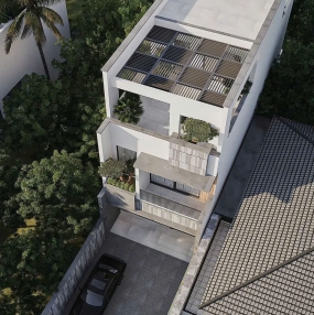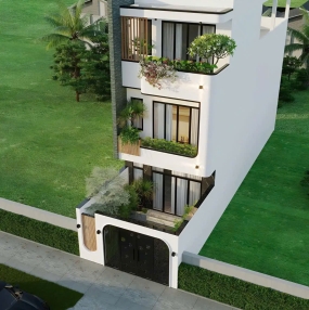 Mặt tiền được thiết kế với phong cách hiện đại và thanh lịch, sử dụng đường nét tối giản, kết hợp lam nhôm và kính cường lực giúp tối ưu ánh sáng và thông gió cho toàn bộ căn nhà. Ban công các tầng được lồng ghép với mảng xanh nhẹ nhàng, tạo điểm nhấn sinh động và gần gũi thiên nhiên.